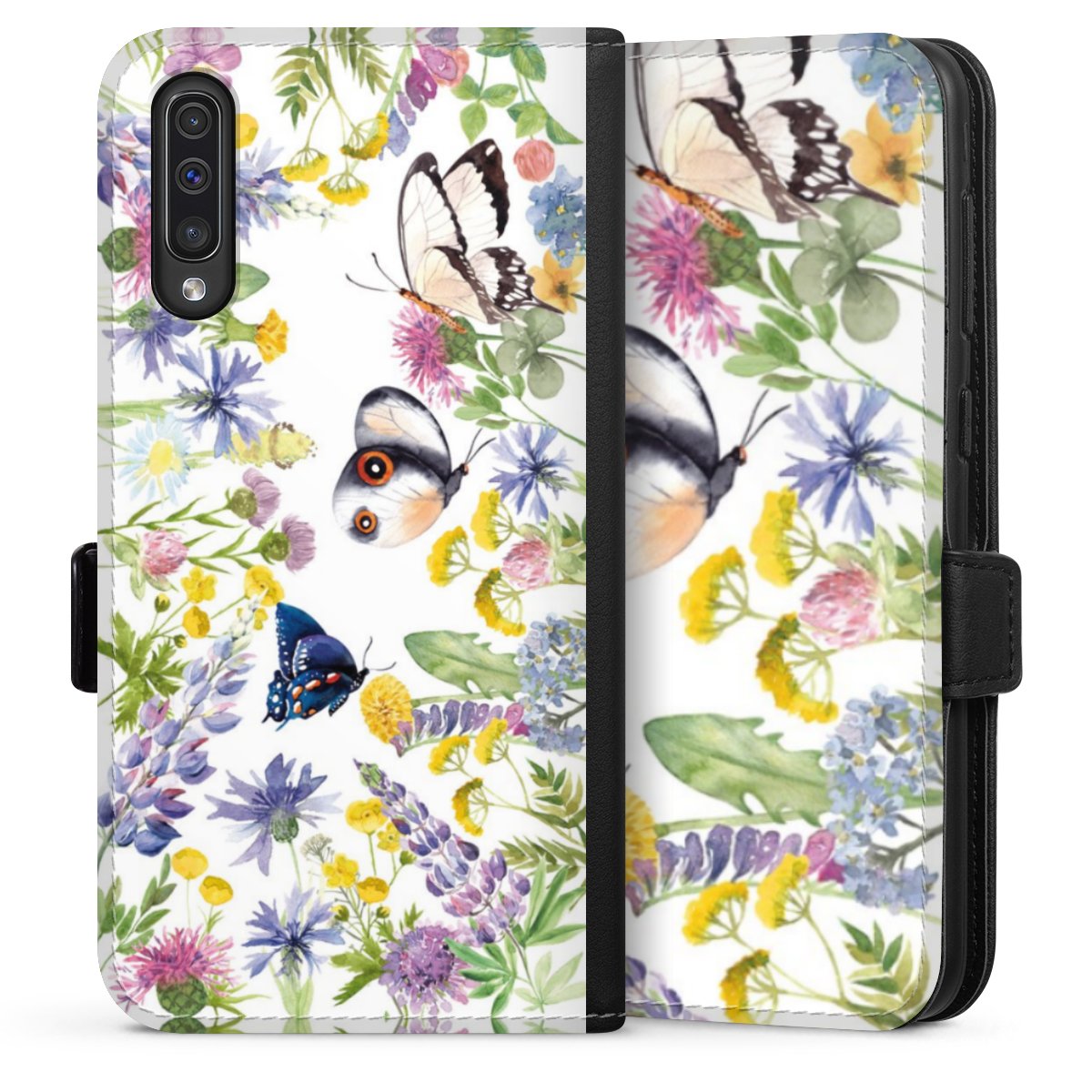 Bunte Frühlingsblumen und Schmetterlinge