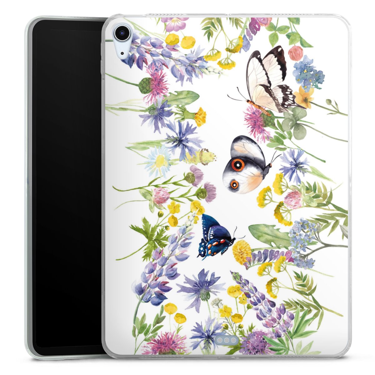 Bunte Frühlingsblumen und Schmetterlinge